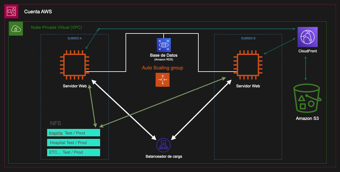 Arquitectura de alta disponibilidad y autoescalado para alojamiento de aplicaciones con Wordpress.El grupo de autoescalado lo forman máquinas que solamente contienen el servidor y que al lanzarse montan el NFS como un disco duro, así el mantenimiento del wordpress es más fácil.