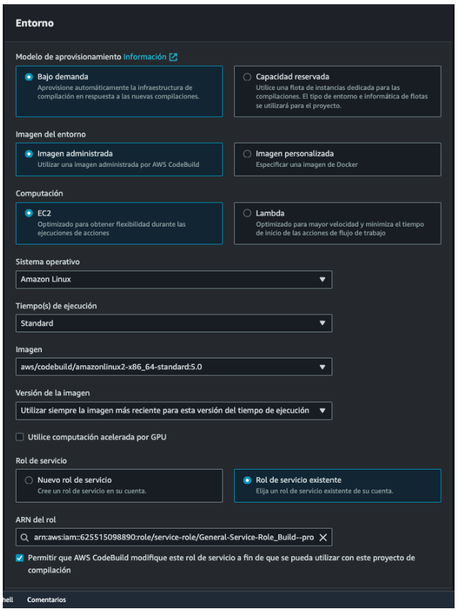 To configure the build project environment, choose the following options. Select the role “General-Service-Role_Build—prod” or “General-Service- Role_Build—test” as appropriate.
