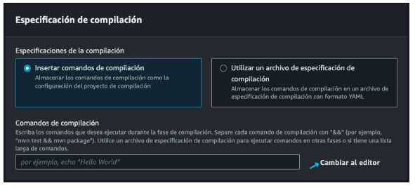 By default, CodeBuild reads a file called “buildspec.yml”, this file contains all the instructions that will be executed in the build stage. This file must be specified in the project. Select “Insert compilation commands” and then “Switch to editor”.