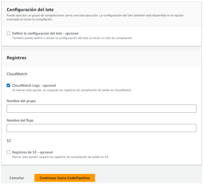 - echo Updating ECS service... - aws ecs update-service --cluster $ECS_CLUSTER_NAME --service $ECS_SERVICE_NAME --force-new-deployment - printf '[{"name":"%s","imageUri":"%s"}]' $CONTAINER_NAME "$ECR_REPO_URI:$IMAGE_TAG" > imagedefinitions.json artifacts: files: imagedefinitions.json- In the following configurations leave as default: