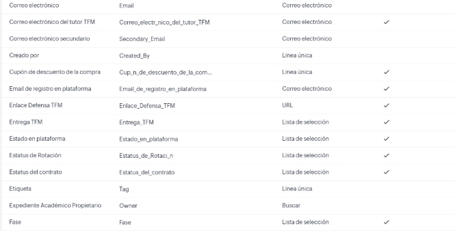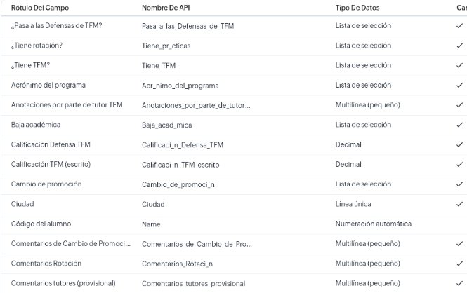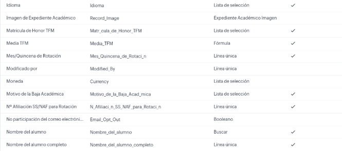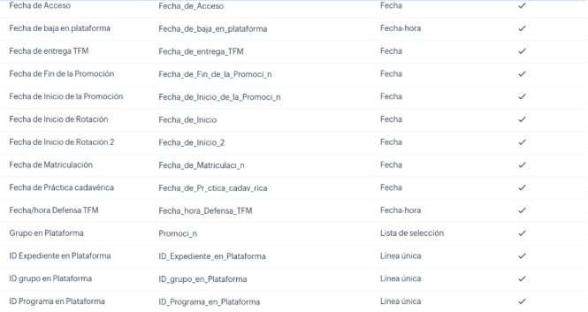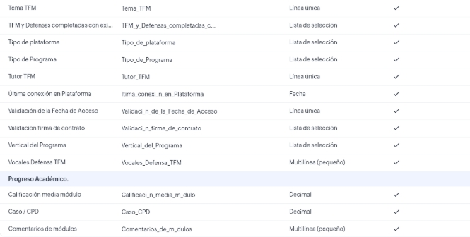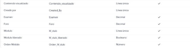 Progreso académico es un “subformulario” del módulo Expedientes Académicos cuyo nombre de API es: Progreso_Acad_mico1. Viene a ser como una tabla en la que cada módulo tiene un registro con los siguientes campos: Orden del módulo, Módulo (nombre del módulo), Examen, Caso / CPD, Foro, Calificación media del módulo, Contenido Visualizado, Módulo liberado y Comentarios del módulo.