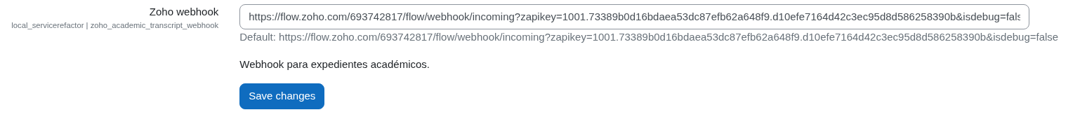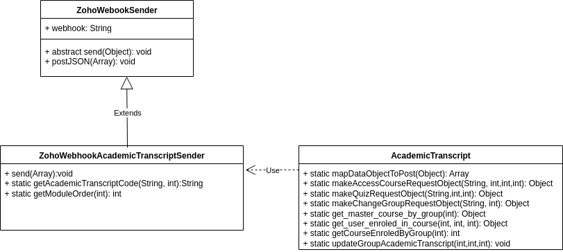 Para el envío de los datos y la actividad especificados en los requisitos, mediante el mencionado webhook, se usan instancias de las clases definidas en el package zoho del plugin “moodle_plugin_servicerefactor” alojado en el repositorio de GitHub.